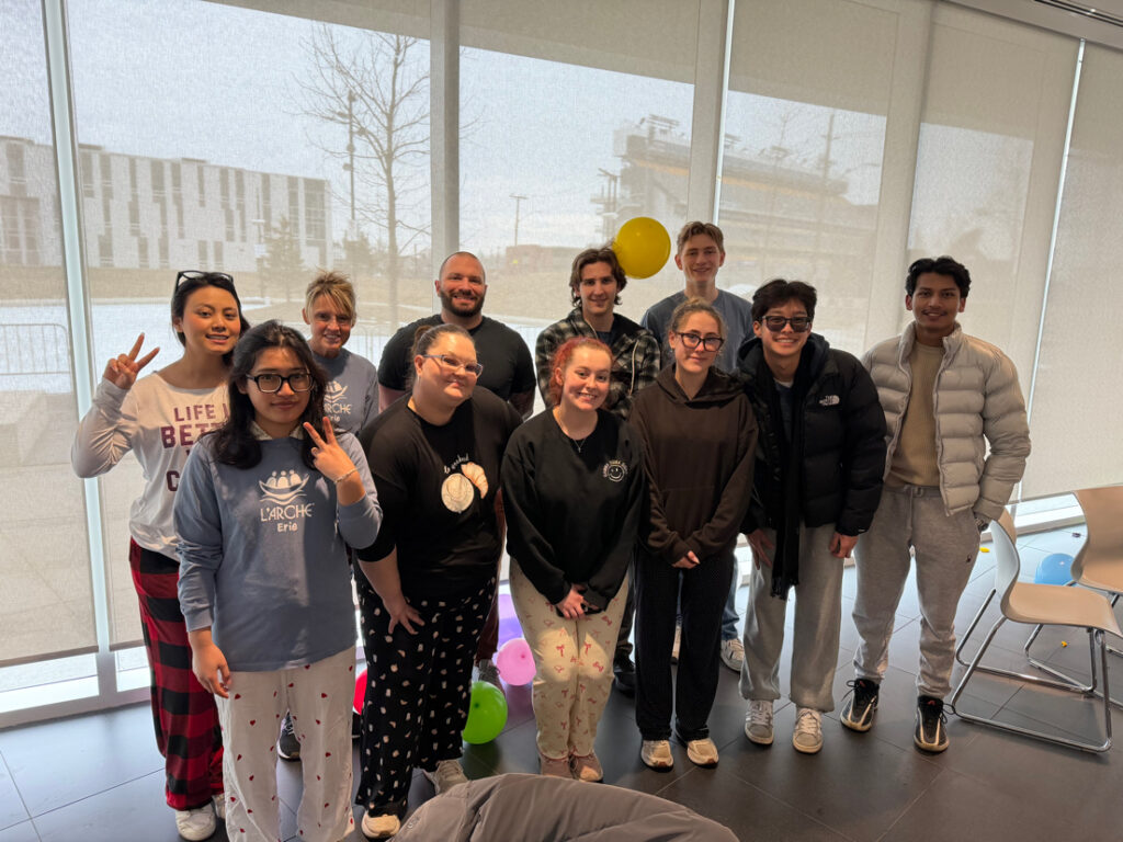 Today we started by eating breakfast at Cornerstone, which is one of the L’Arche homes here in Hamilton. After this, the group went to the “Inclusion Coffeehouse,” which is a cafe located at a local recreation center. We had been in contact with L’Arche, Hamilton before the trip and planned to help host a Pajama Party during our time there. We helped with various tasks, set up activities such as puzzles, cookie-making and arts and crafts. After it was all set up, we spread out, sat down, and did these different activities with core members, and people who came to buy coffee. There was even a local singer from Hamilton who played songs such as “Freefalling,” and “Valerie.” I was at the puzzle station and worked on a 1000-piece puzzle with a few core members. This was a lot of fun, but it was impossible to finish in time. After this, I helped set up a projector, and visitors were able to dance to instructional dance videos, which were being shown on the projector screen.
